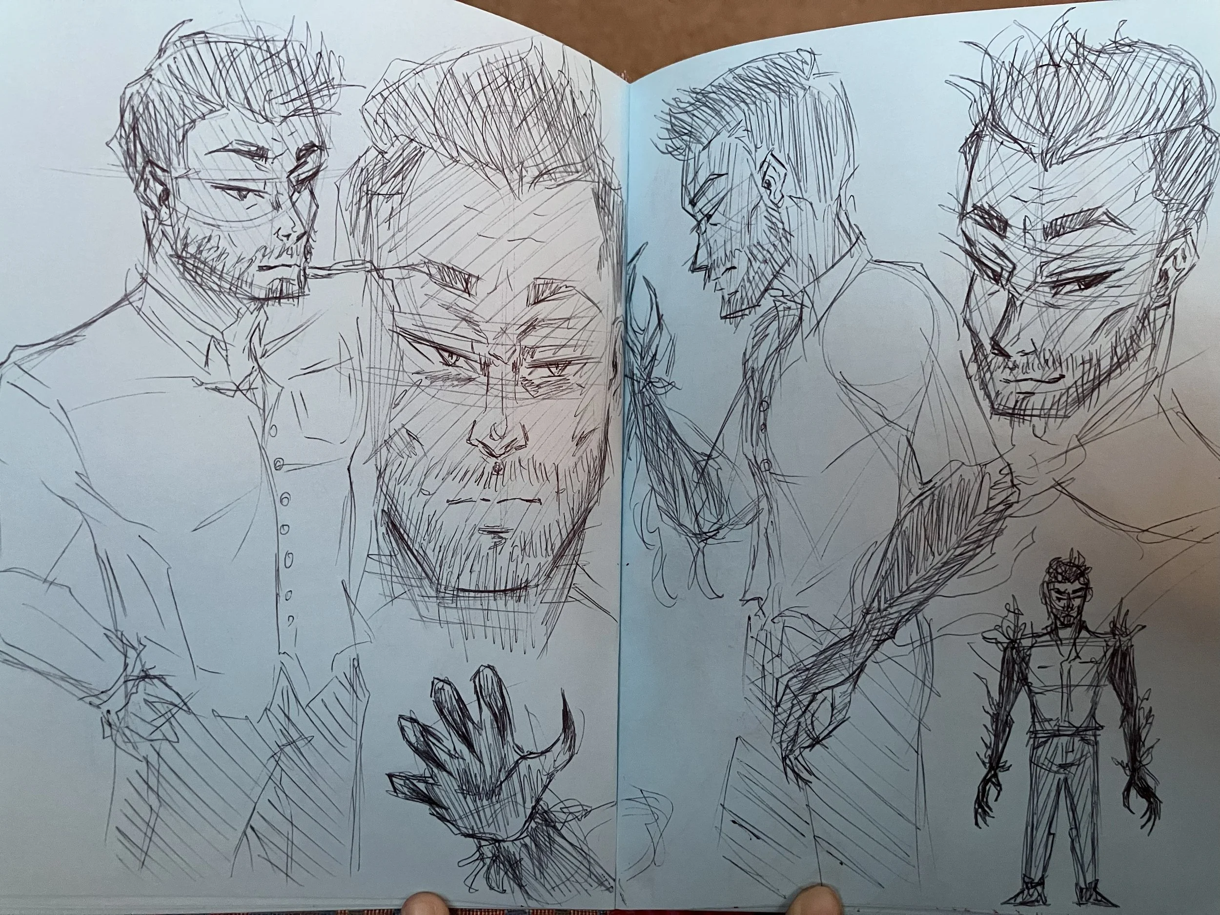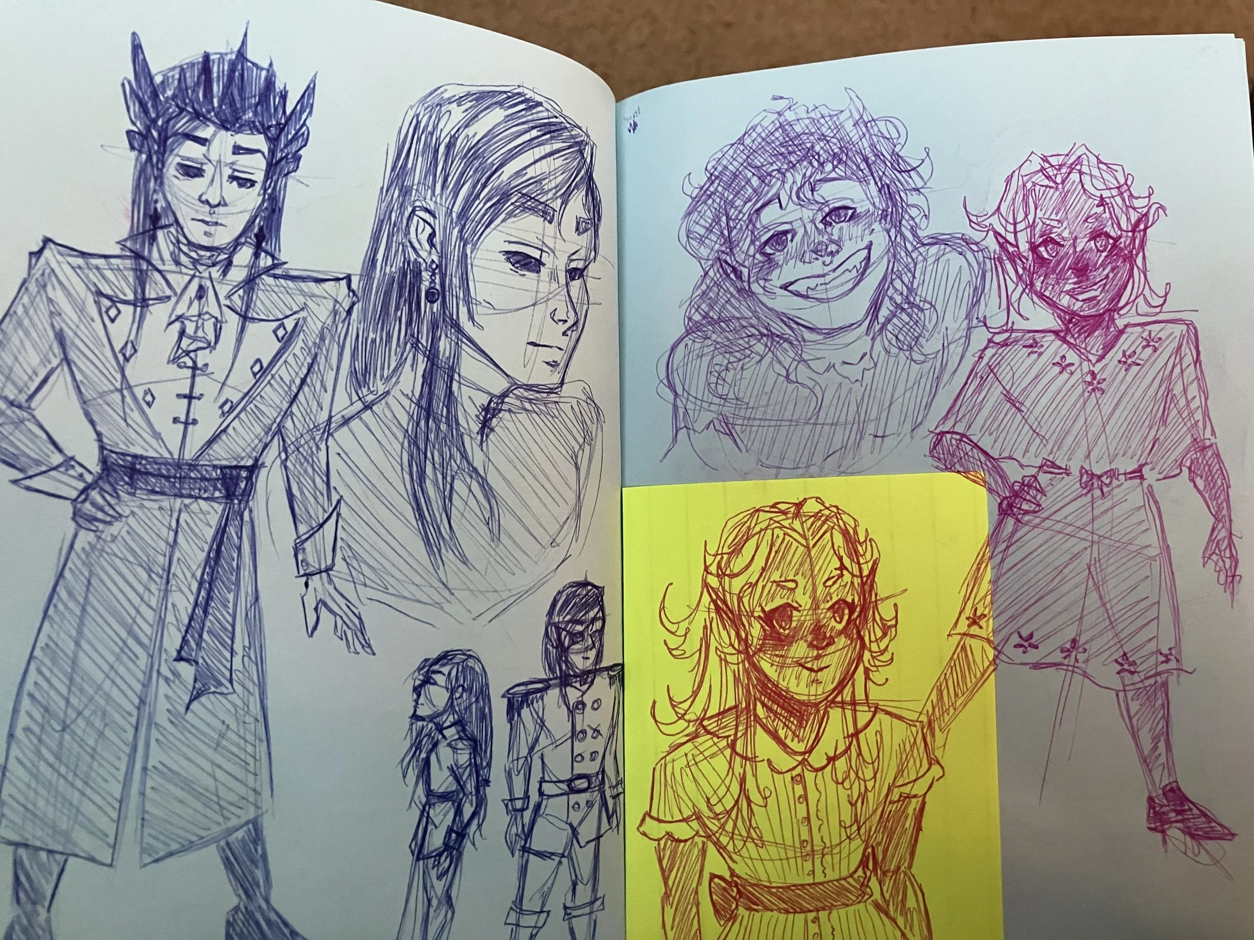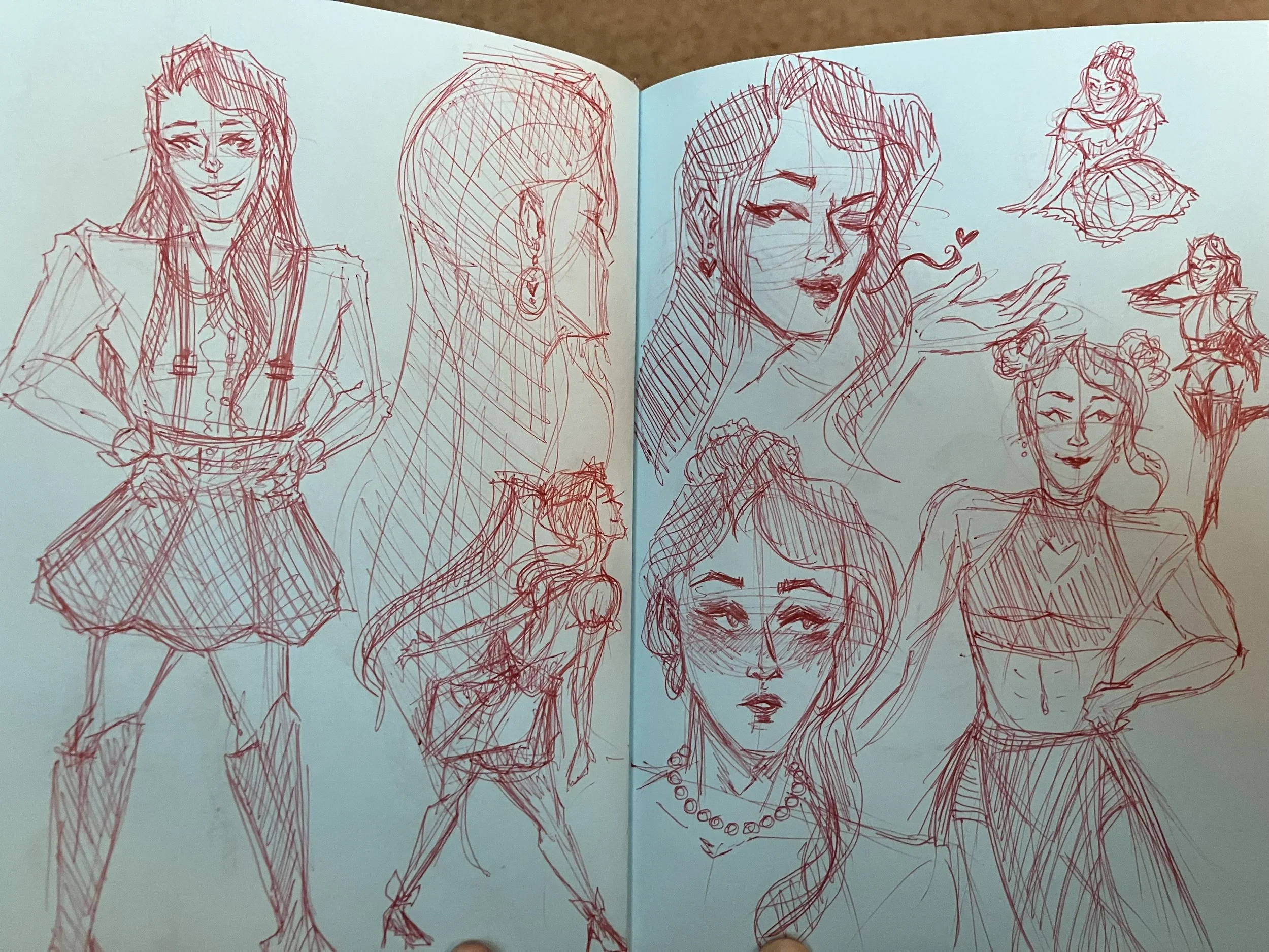 Sketchbook predominantly used in late 2025 featuring ballpoint pen sketches, graphite sketches, and occasional Primsa colored pencils and Copic markers.
