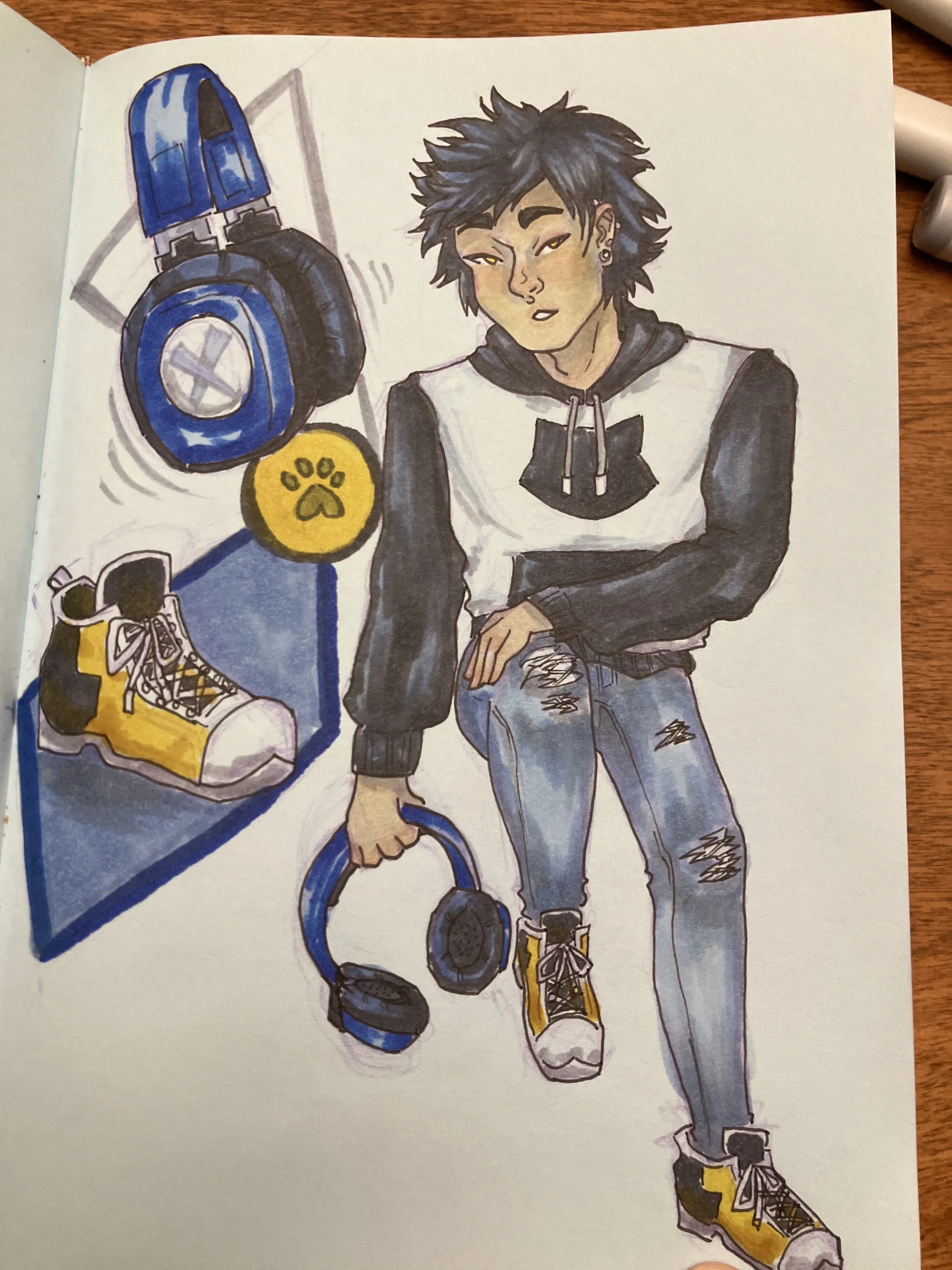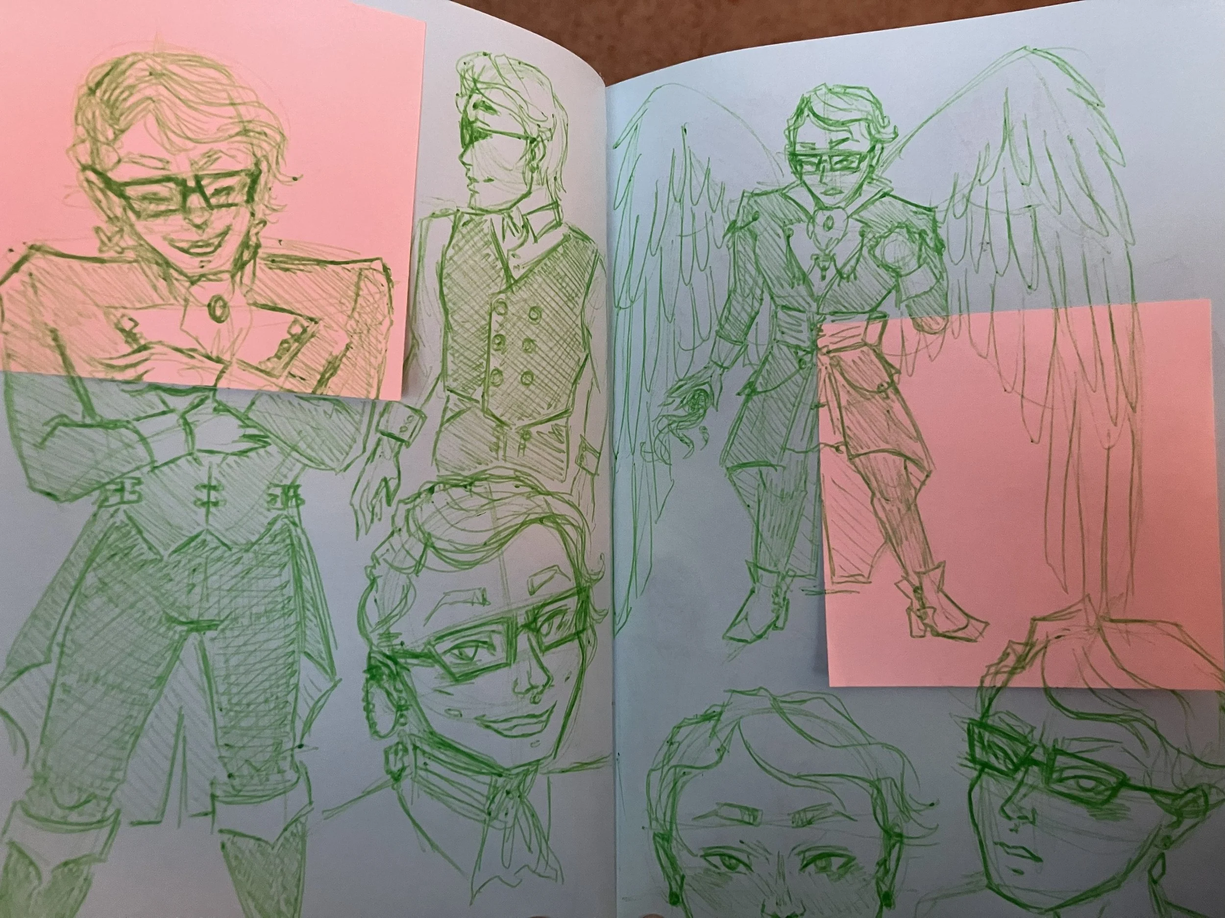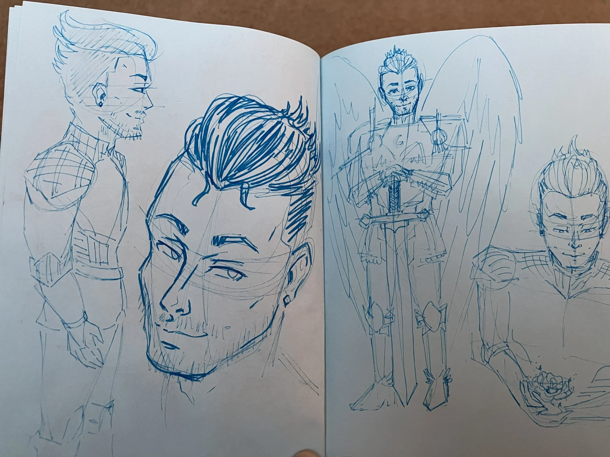 Sketchbook predominantly used in late 2025 featuring ballpoint pen sketches, graphite sketches, and occasional Primsa colored pencils and Copic markers.